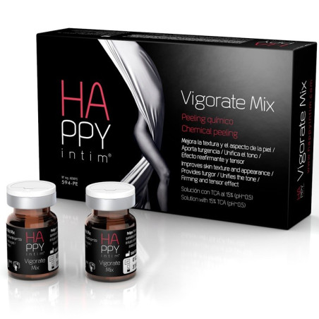 HAPPY intim® Vigorate Mix ist ein neues chemisches Peeling auf TCA-Basis, das mit Antioxidantien, Glykol- und Zitronensäure angereichert ist und einen aufhellenden Effekt hat. Die Formel wurde speziell entwickelt, um die intime Hautstruktur zu verbessern und Unvollkommenheiten der Hautfarbe zu klären. Sie sorgt für Turgor-, Straffungs- und Tensoreffekt.