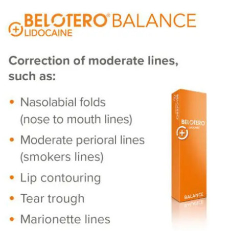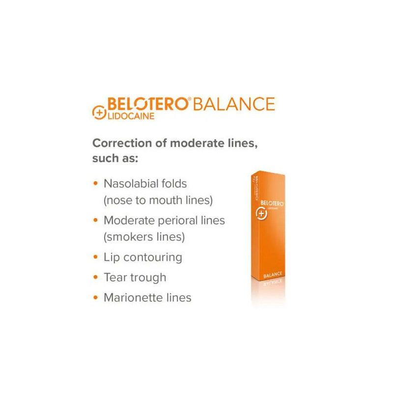BELOTERO Balance (with or without Lidocaine) is an injectable and biodegradable filler indicated for injection into the superficial to medium dermis for the correction of wrinkles and moderate facial furrows (nasolabial folds, bitterness folds, wrinkles perioral and oral commissures) as well as in increasing the volume of the lips.